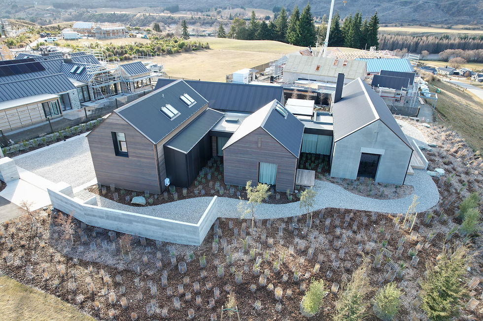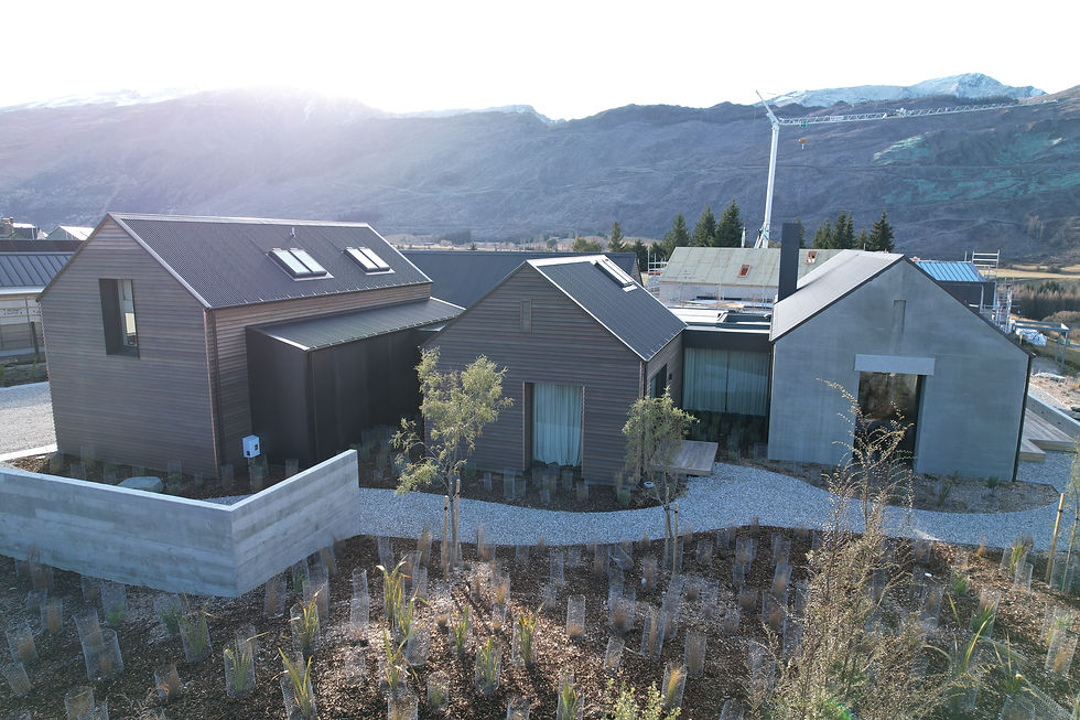 Designed by Warren & Mahoney this 417m2 gabled home was build from precast panels and cedar weatherboards with a corrogated roof.